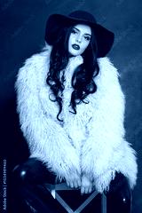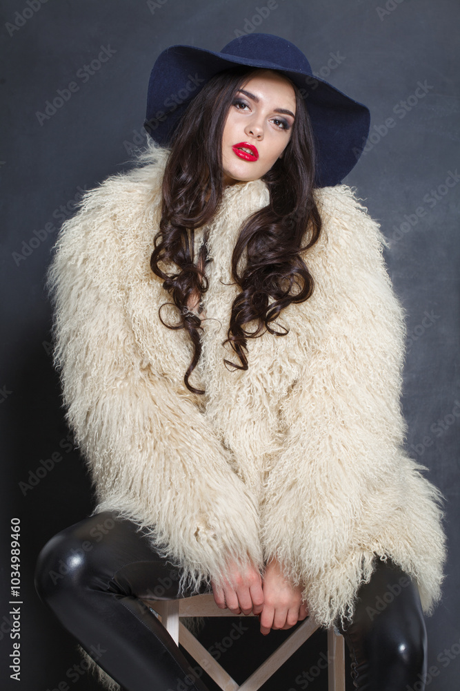 Cheerful fashion model woman in blue classic hat and white fur coat posing indoor, elegance fashion beauty portrait