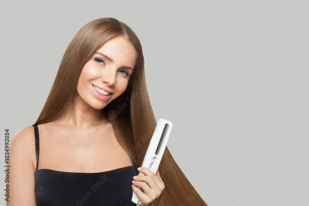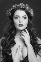 Pretty healthy female model with shiny hair, make-up and spring flower on black background