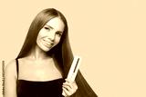 Gorgeous woman with long hair using a straight hair iron and doing a hairstyle, beauty, care and fashion concept