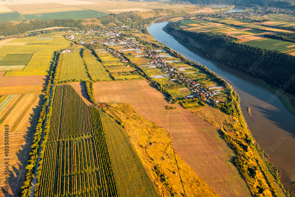 A picturesque bird's eye view of the Dniester river canyon and agricultural lands. Agrarian region of Ukraine, Europe.
