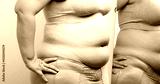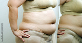 Asian oversize woman in front of a mirror looks at her body. Excess belly fat, Unhealthy lifestyle, Diet concept.