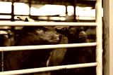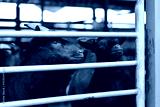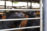 Two goats are looking out of a metal fence. One goat is black and the other is brown