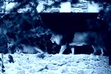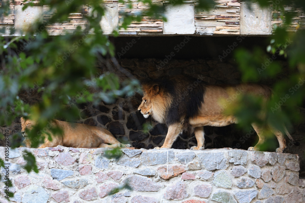 Two lions are walking in a zoo enclosure. One of the lions is laying down. The enclosure is made of stone and has a lot of trees