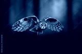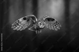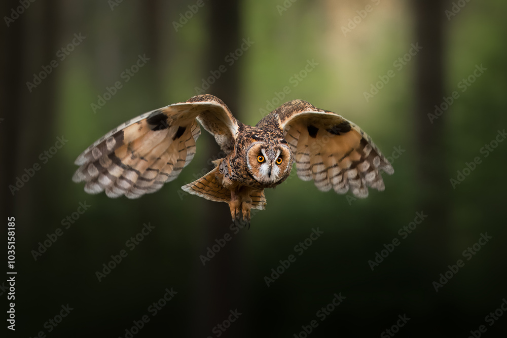 Detail portrait of long-eared owl is flying in forest.