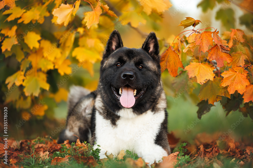 american akita dog lying down under a maple tree in autumn with beautiful orange and yellow leaves