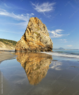 Rock cliff on the beach with reflection in the water, beautiful scenery of Oregon, USA.