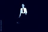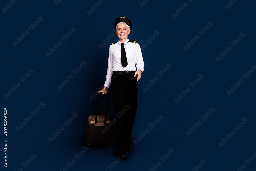 Full length photo of lovely pensioner lady commercial pilot suitcase walk dressed aviator uniform isolated on dark blue color background