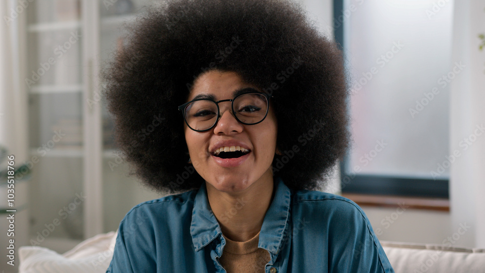 Close up amazed wonder lady at home surprised portrait female headshot indoors ethnic shocked astonish reaction wow amazing African American woman looking at camera smiling laugh unbelievable shock