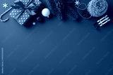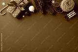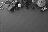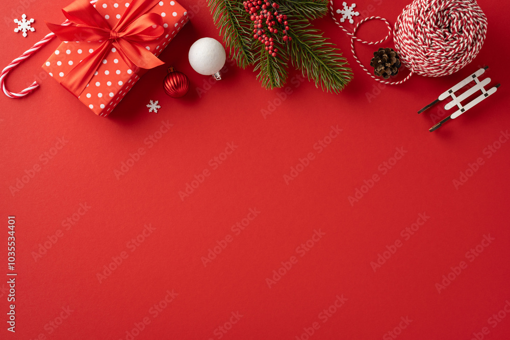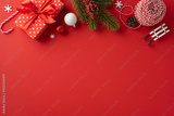 Brightly colored Christmas decorations and gifts on a classic red background evoke festive cheer and holiday spirit