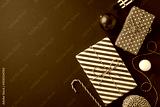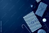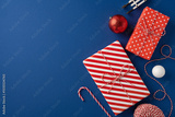Colorful wrapped presents with festive designs are set on a top view blue backdrop, featuring a candy cane and Christmas ornaments