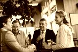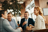 Group of business people having coffee and talking in a cafe decorated for the christmas and new year holidays