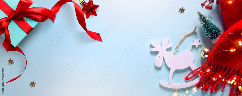 Christmas blue light background with Xmas sparkling lights garland and Christmas tree decoration, top view, copy space. Horizontal Christmas poster, greeting card or banner