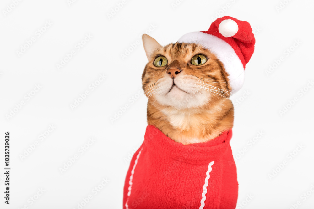 Beautiful Bengal cat in Santa costume.