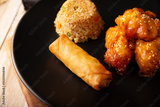 Sweet and sour chicken with fried rice and crispy spring roll, American Chinese food made out of fried, battered chicken covered with sauce. Tasty dish popular in many countries.