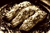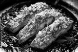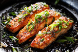 Teriyaki salmon filets sprinkled chopped scallion in a black baking dish, focus on the middle, close up view