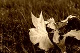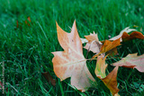 Dry fallen brown maple leaves lying on fresh green grass in autumnal garden, park. Fall season nature. Dry leaf lie on a ground. Autumnal landscape.
