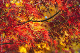 Japanese maples with yellow and red foliage on the branches during the fall season. Autumnal nature in October, November park garden Change of seasons