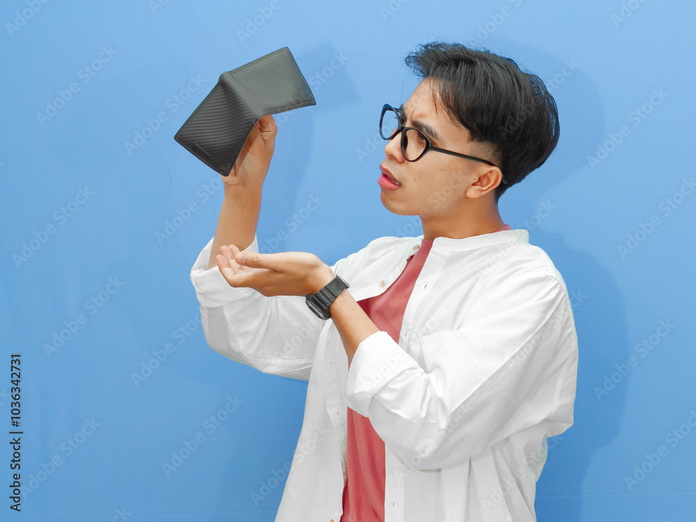 Portrait of a young Asian man looking at an empty wallet with a funny sad and frustrated expression on a blue background.