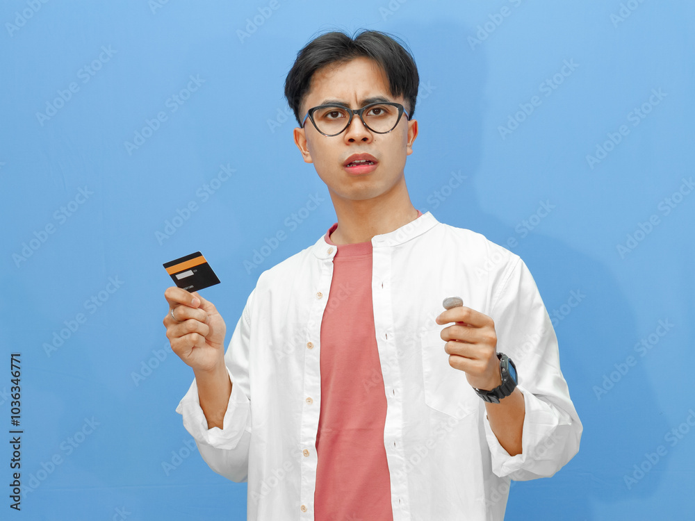 Sad portrait of a young Asian man holding a credit card and a coin, expressing financial frustration on an isolated blue background.
