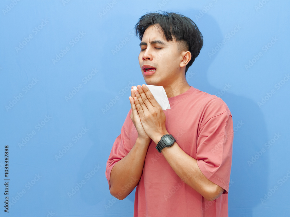 Unhealthy young man holding tissue, preparing to sneeze, expressing sadness and pain, isolated on blue background.