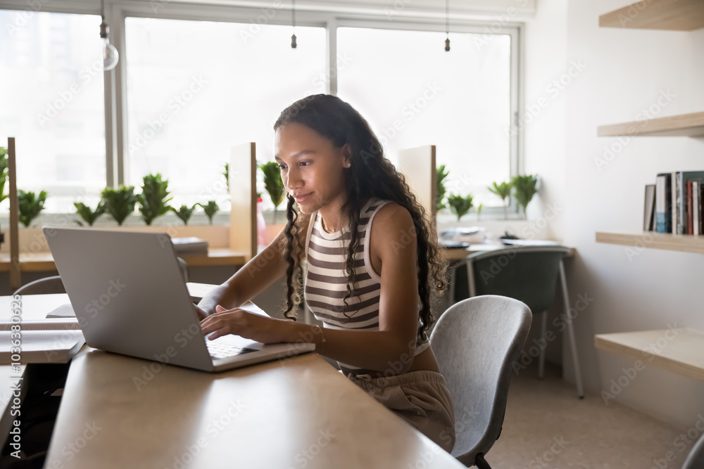 Focused fresh female African American student browsing Internet in public college library, typing on laptop, working with online information for article, project report for class