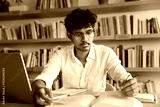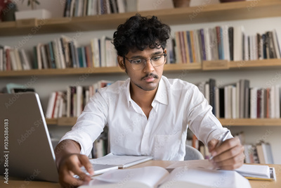 Focused smart male Indian student reading textbook in library, writing notes for essay, scientific article, research paper, sitting at workplace table with laptop, studying open book
