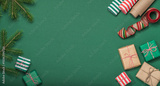 Christmas banner, frame, background with fir branches and paper gift boxes and wrapping paper. DIY gifts