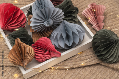 Scandinavian Christmas paper honeycomb in a wooden box, glowing garland on a knitted blanket. Eco-friendly sustainable Christmas decorations. Christmas background.