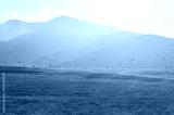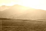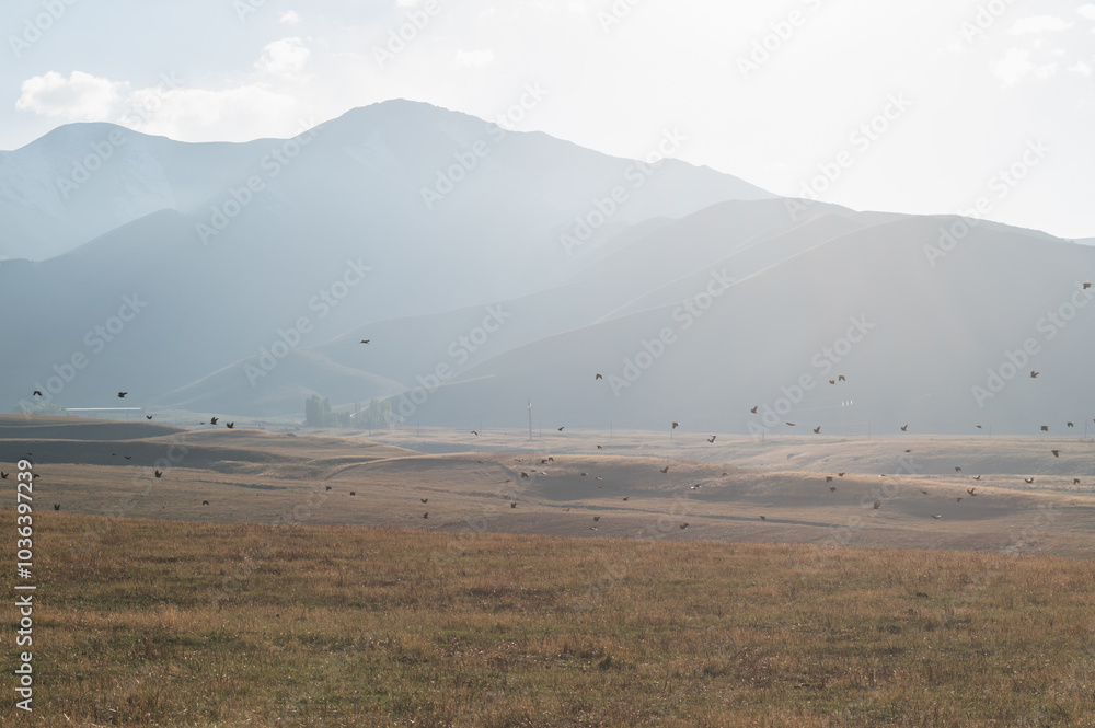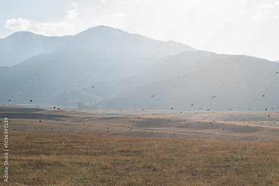A flock of black crows over fields in foggy mountains. Quiet cozy autumn.
