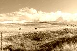 Horses graze in autumn fields in the mountains. Organic livestock farming.