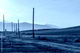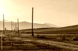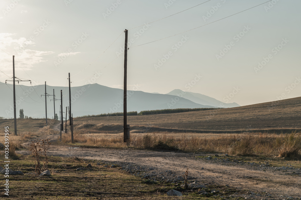 Dirt country road among autumn dry meadows and hills. Cozy autumn.