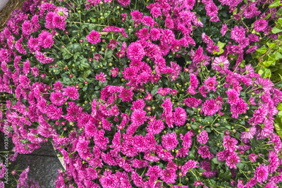 Small chrysanthemums in a flowerpot close-up. Autumn arrangement.