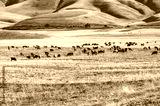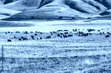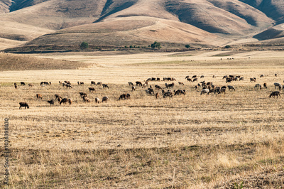 Grazing a flock of sheep in autumn fields against the backdrop of snow-capped mountains.