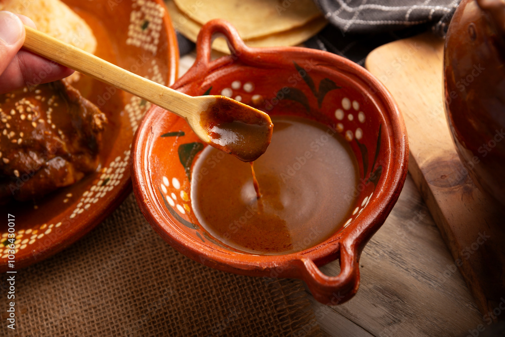 Mole Poblano. Chicken with Mole. Typical dish, emblematic of Mexican food made with a mixture of numerous ingredients. Mole sauce is commonly served with chicken or turkey.