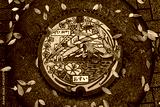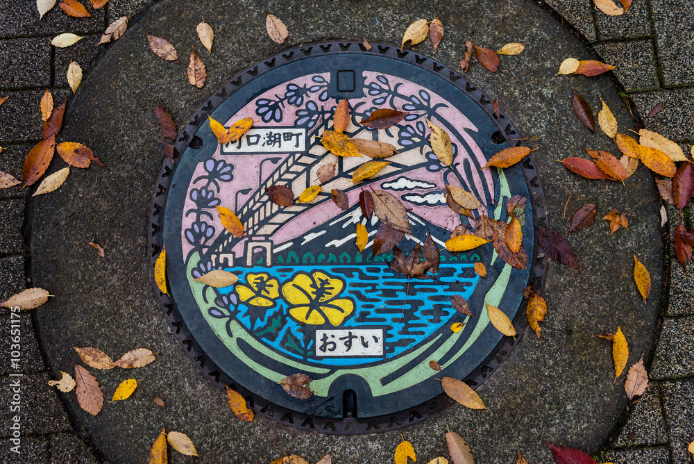Metal sewer manhole of Kawaguchiko lake art color street in autumn