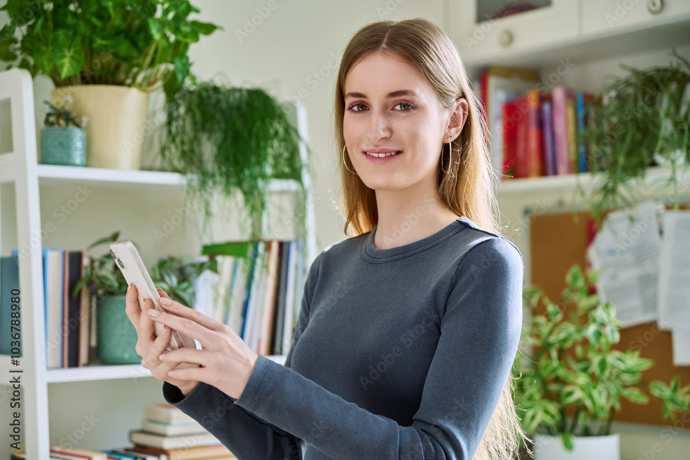 Portrait of teenage smiling female with smartphone looking at camera in home interior