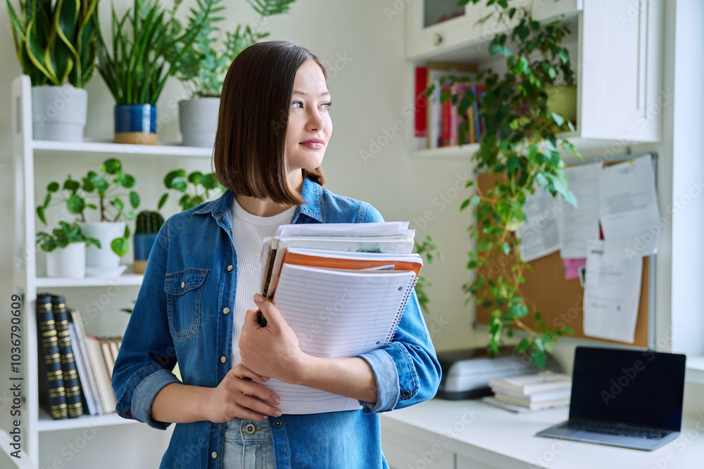 Portrait of woman university student, young teacher holding textbooks notebooks, in home