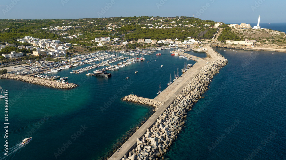 Aerial view of the Leuca lighthouse on the top of Punta Meliso. This is located in Santa Maria di Leuca in Salento, Puglia, Italy. In foreground is the touristic port of the city.