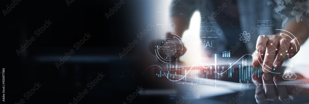 Big data analytics with AI technology. Data analyst analyzing and visualizing information network with artificial intelligence. Machine learning algorithm, software for business analytics and finance