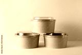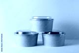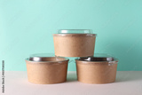 Cardboard round food boxes with plastic lid on table, turquoise background