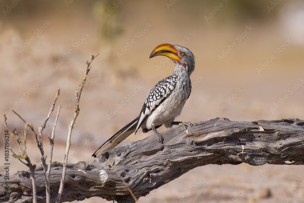 Southern Yellow-billed Hornbill, Tockus leucomelas, bird with big bill in the nature habitat with evening sun, sitting on the branch, on the ground, close up