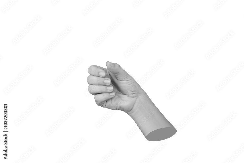 Female statue's hand with clenched closed fingers making a gesture like holding something isolated on a white background. Trendy 3d collage. Contemporary art. Modern creative design. Mockup for insert