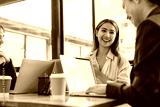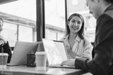young woman smiles while engaging in conversation with colleagues at modern office setting. atmosphere is collaborative and friendly, with laptops and coffee cups on table