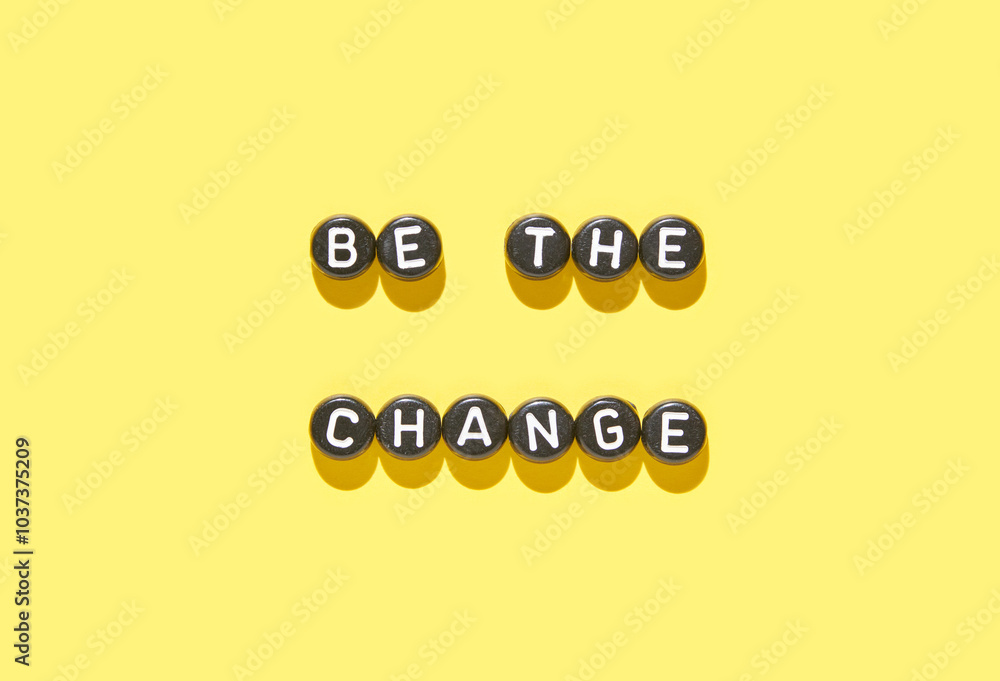 Inspirational message be the change on bright yellow background with block letters in modern design.