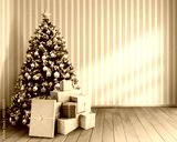 A beautiful Christmas Tree adorned with presents set in a stylish minimalist retro interior
