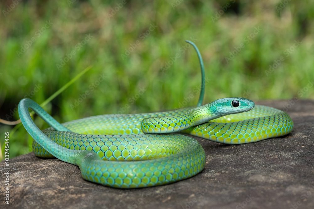 A beautiful Western Natal Green Snake (Philothamnus occidentalis) on a large rock in the wild