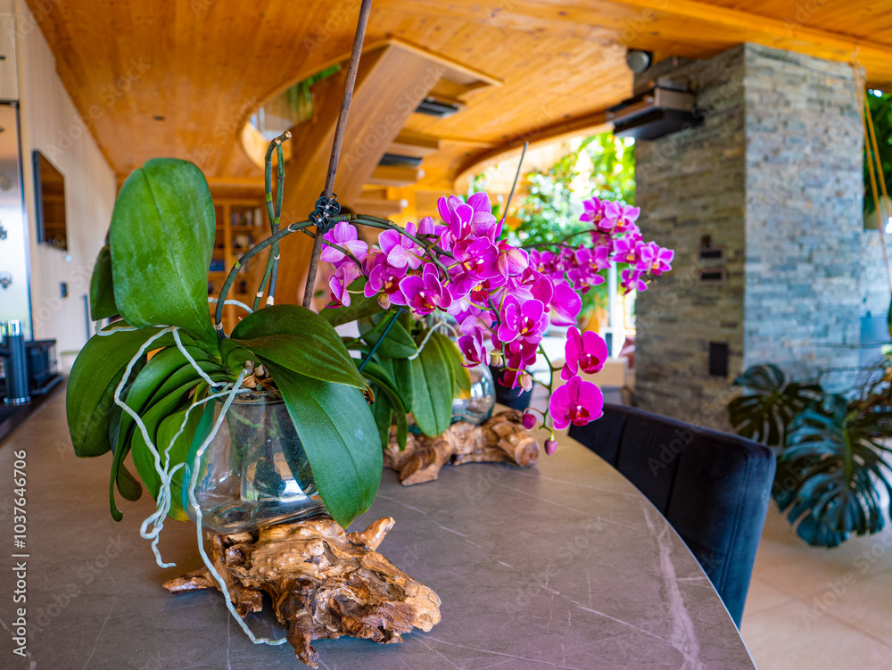 CLOSE UP, DOF: Gorgeous orchid flower in full bloom in the middle of the comfortable-looking living room. Closeup shot of a blooming orchid with a blurry backdrop of a cozy atmospheric sitting room.