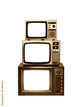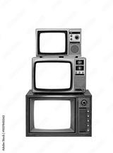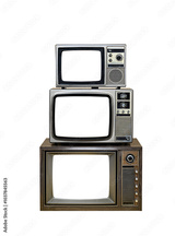 Pile of three old vintage TVs with clipping path isolated on white background. Antique retro three old televisions over white
