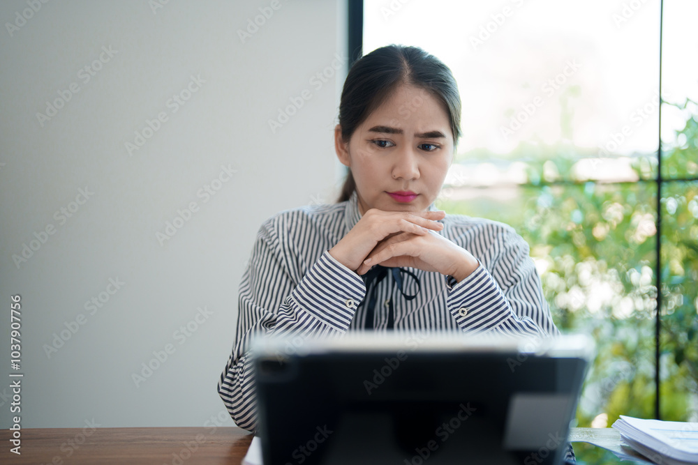 A young woman is sitting at her desk, looking thoughtful as she focuses on a tablet. She appears to be carefully considering something, with documents spread around her
