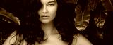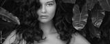 Brunette woman with voluminous curly hair and a confident gaze poses against a backdrop of lush tropical green leaves. Ideal for promoting beauty, haircare, fashion, or nature-inspired products.